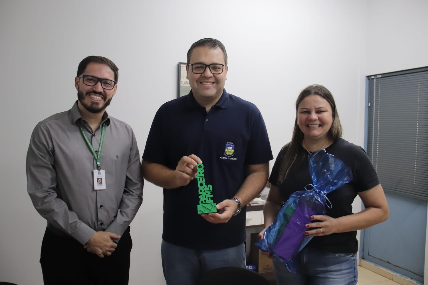 O diretor-geral do Campus de Dourados do IFMS (Instituto Federal de Mato Grosso do Sul), Carlos Vinícius da Silva Figueiredo, visitou a Prefeitura de Dourados nesta segunda-feira (19). Ele foi recebido pelo prefeito Alan Guedes e pela secretária de Educação, Ana Paula Benitez Fernandes e aproveitou para entregar à ambos um troféu de parceiro da entidade.