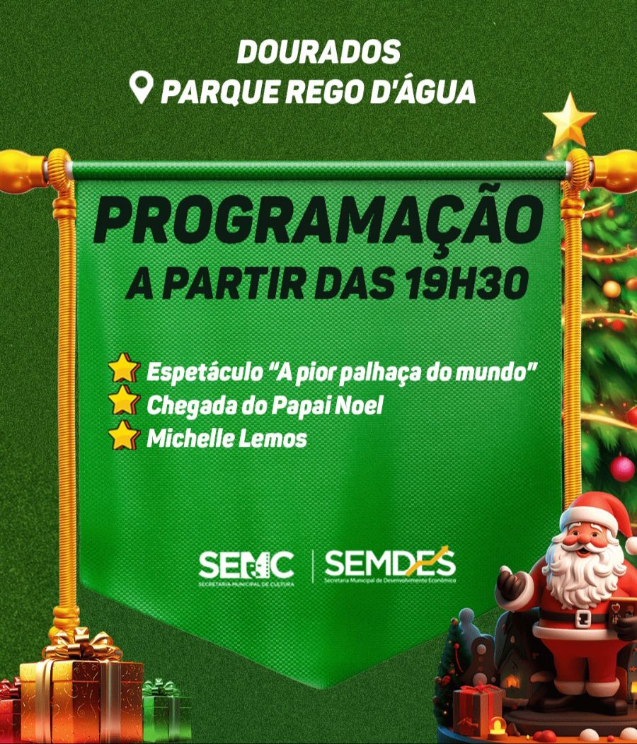 A programação do Dourados Brilha 2023 segue nesta terça-feira (12). No Parque Rego D’Água, no Grande Água Boa, acontecem apresentações artísticas a partir das 19h30.