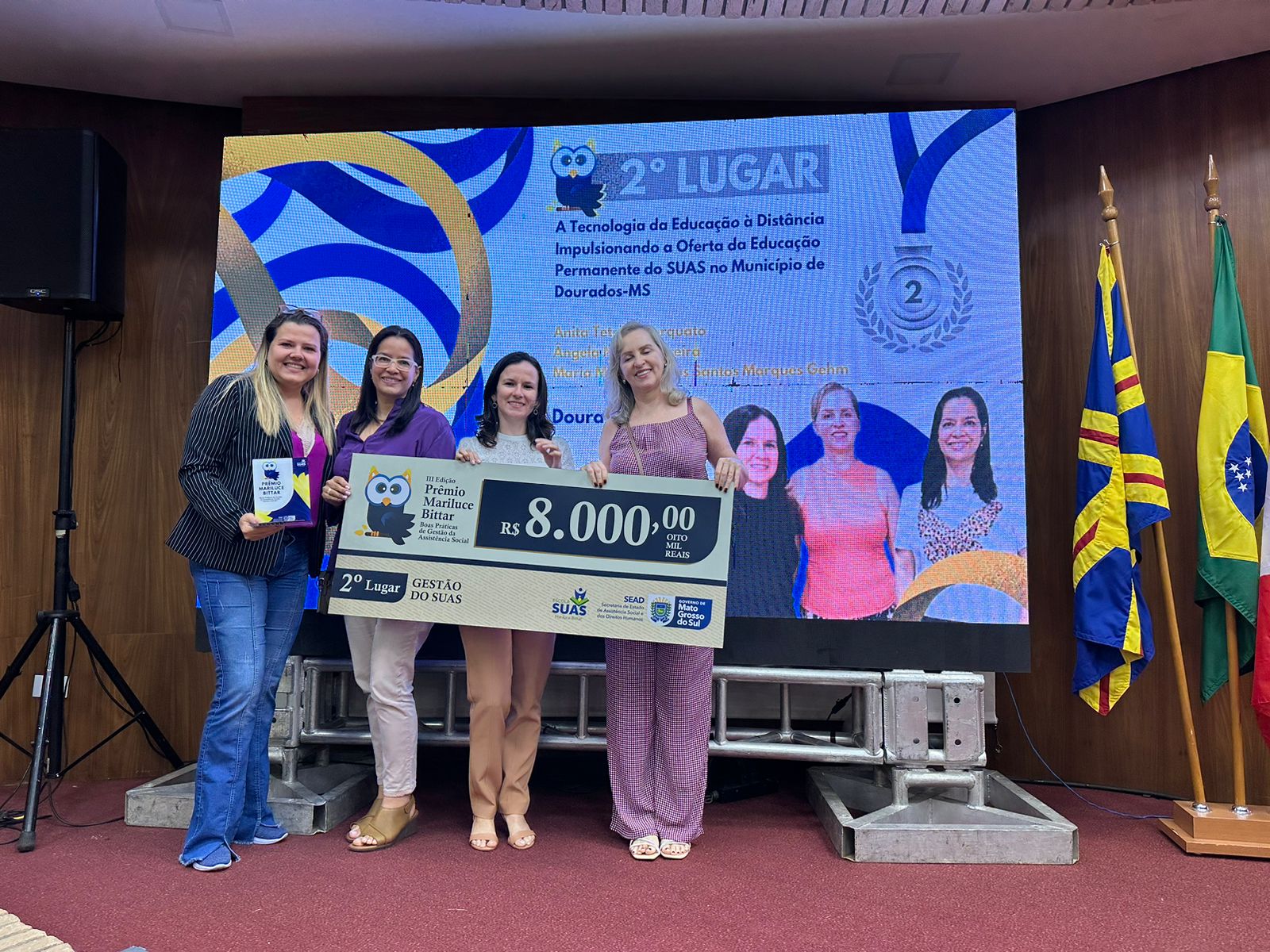 Nesta segunda-feira (11), o Núcleo de Educação Permanente da Secretaria Municipal de Assistência Social (SEMAS) de Dourados brilhou ao conquistar o 2º lugar no prestigiado Prêmio Mariluce Bittar, na categoria Gestão do SUAS. O reconhecimento foi resultado da implementação bem-sucedida do projeto “A tecnologia da Educação a Distância Impulsionando a Oferta da Educação Permanente do SUAS no Município de Dourados-MS” desenvolvido pelas servidoras Ângela Maria Teixeira, Maria Madalena dos Santos e Anita Tetslaff.