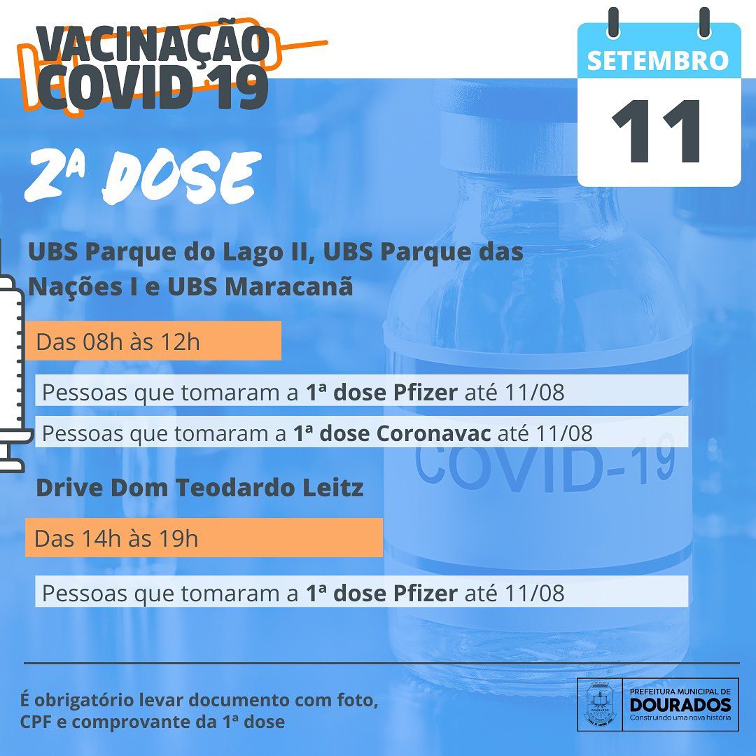 A Sems (Secretaria Municipal de Saúde) informa que neste sábado (11) haverá vacinação de Dose 2 da vacina Pfizer para quem tomou Dose 1 até o dia 11 de agosto, no Drive-thru do Pavilhão de Eventos, Dom Teodardo Leitz.