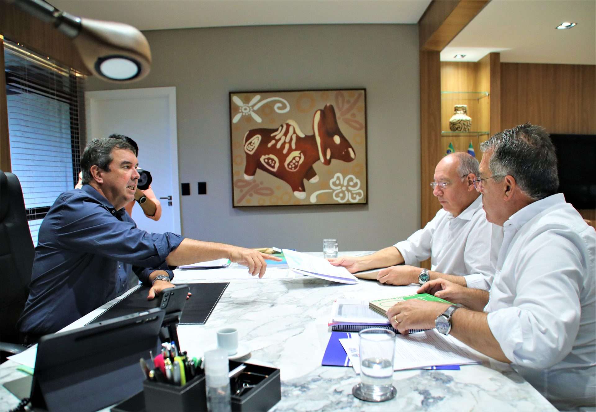 O governador Eduardo Riedel se reuniu nesta quarta-feira (24) com o prefeito de Ponta Porã, Eduardo Campos. No encontro foram discutidas obras de infraestrutura urbana ao município. A expectativa é o investimento de mais de R$ 30 milhões para pavimentação de bairros na cidade.