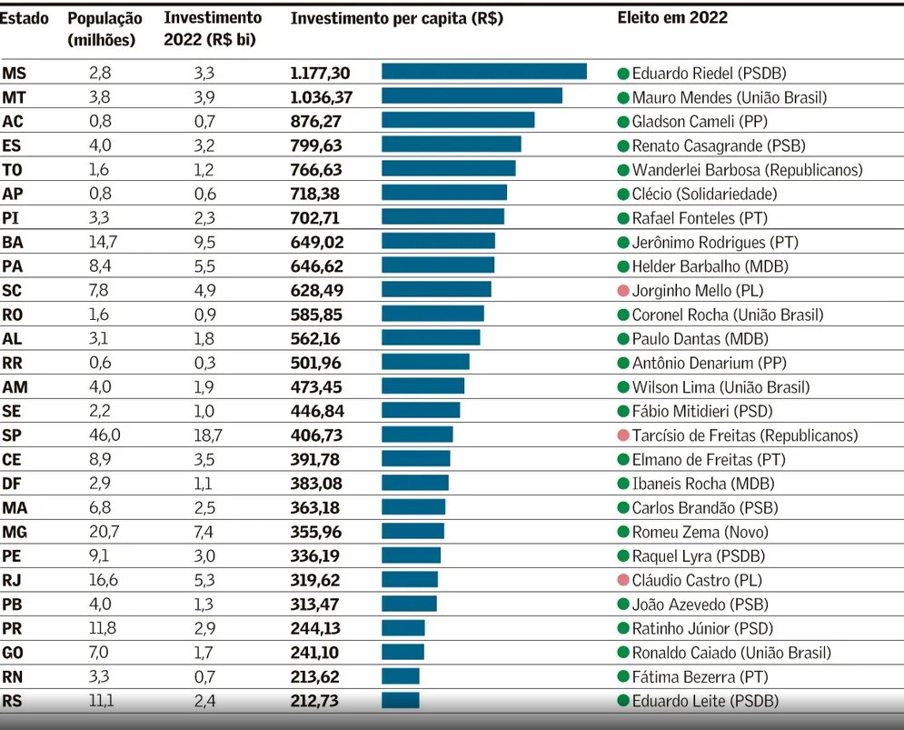 Reportagem divulgada pelo jornal Valor Econômico revela que Mato Grosso do Sul continua liderando o ranking de investimentos por habitantes, entre os 26 estados e o Distrito Federal. O Estado investiu cerca de R$ 1.177 por habitante em 2022. Os investimentos incluem, principalmente, obras de infraestrutura. O levantamento foi realizado, a partir do Relatório Resumido da Execução Orçamentária (RREO), de cada unidade da federação.