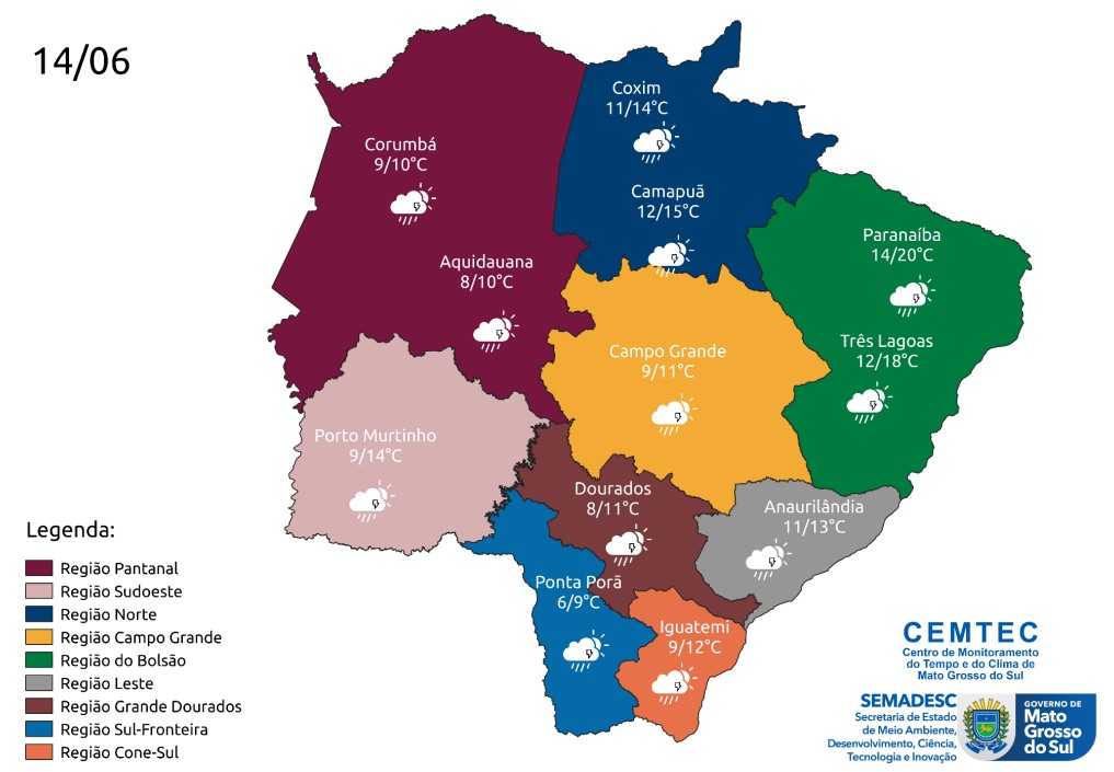 Em Dourados, temperatura de 8°C no amanhecer e atingindo os 11°C durante a tarde.
