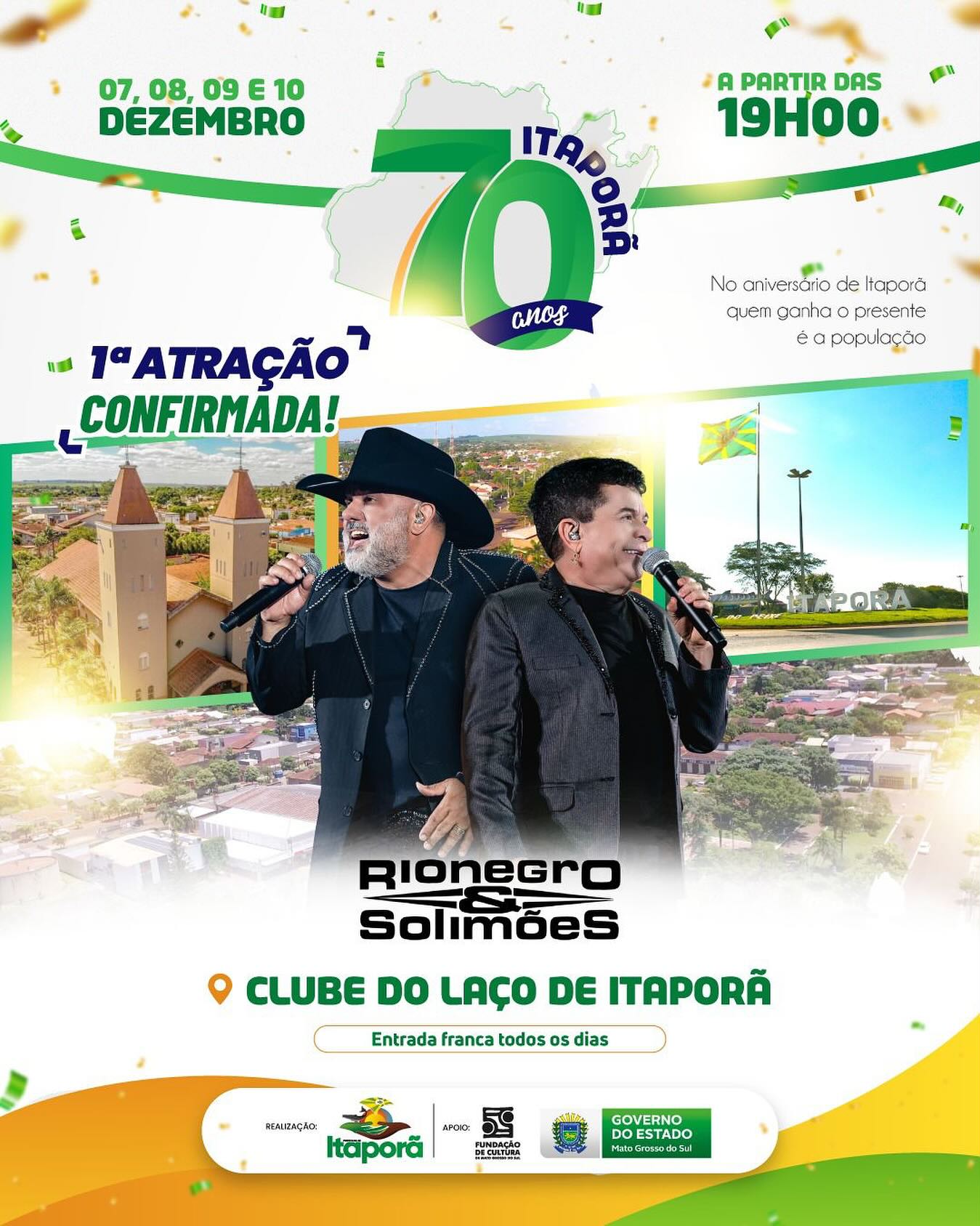 Com este e outros excelentes shows, o Itaporã 70 Anos, terá quatro dias de festa, 07,08,09,10 de dezembro com um mega sistema de palco e sonorização, parque de diversão e uma ampla praça de alimentação.