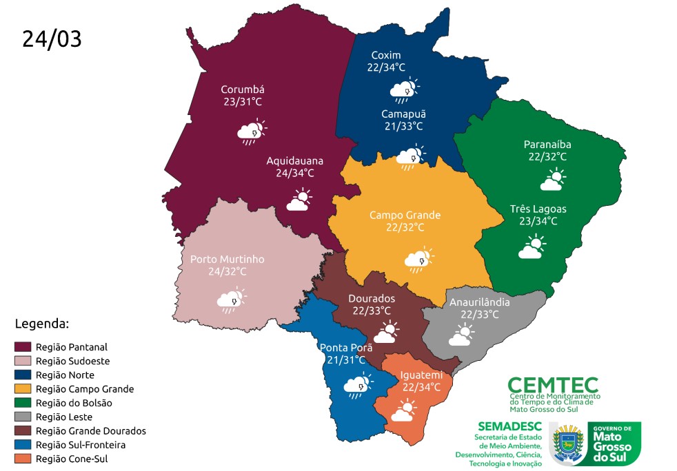 No Estado, são previstas temperaturas mínimas de 21°C e máximas de 35°C. Nas regiões sul e leste, mínimas de 22°C e máximas de 34°C. Já na região norte, as mínimas registram 21°C e máximas de 34°C. Na capital, espera-se mínimas de 22°C e máximas de 32°C. Na região pantaneira, onde podem ocorrer chuvas mais fortes, a mínima será de 23ºC e a máxima de 34ºC.