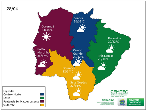 Na região Pantaneira, Corumbá deve ter máxima de 36°C e Porto Murtinho de 37°C. Nessas cidades, as mínimas ficam em 23 e 25°C, respectivamente.